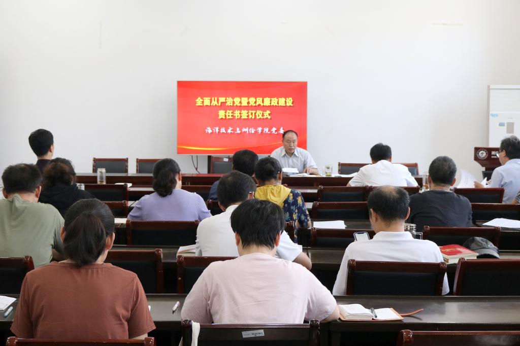 会上,冯凤麟和学院党政领导班子成员、各党支部书记签订了全面从严治党责任书,领导班子成员按照党风廉政责任网络分别和分管工作部门负责人签订了党风廉政责任书,非党员部门负责人递交了廉政建设承诺书。