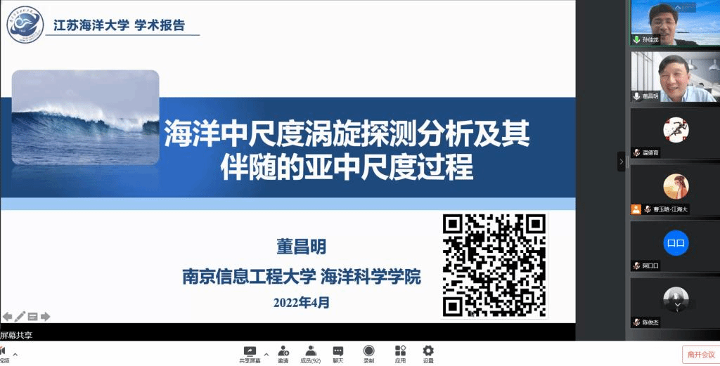4月13日下午,南京信息工程大学董昌明教授在腾讯会议平台为我院师生做了题为“海洋中尺度涡旋探测分析及其伴随的亚中尺度过程”的学术报告。报告会由院长孙佳龙主持,100多名师生在线聆听了报告。