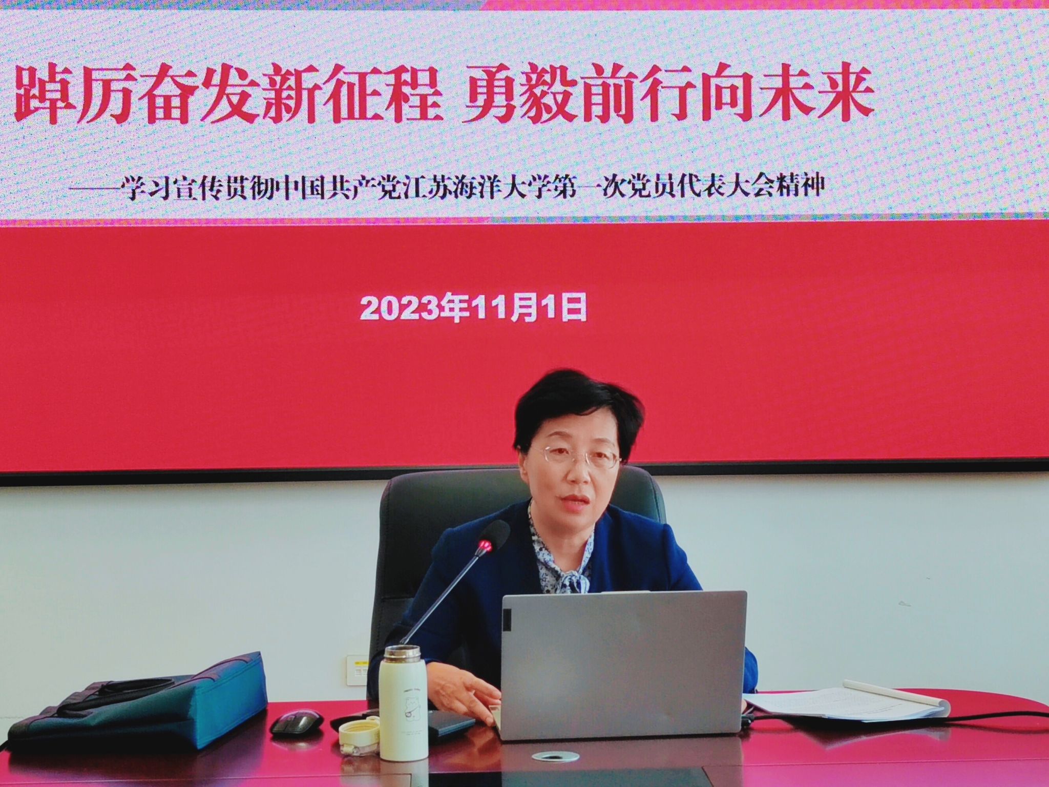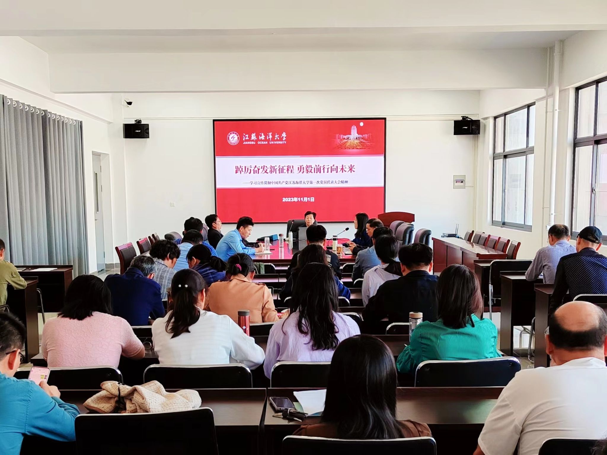 为深入学习贯彻中国共产党江苏海洋大学第一次党员代表大会精神,11月1日下午,学院党委邀请校党委副书记李梅英做专题宣讲,全体教职工参加学习,学院党委书记王晶主持宣讲会。