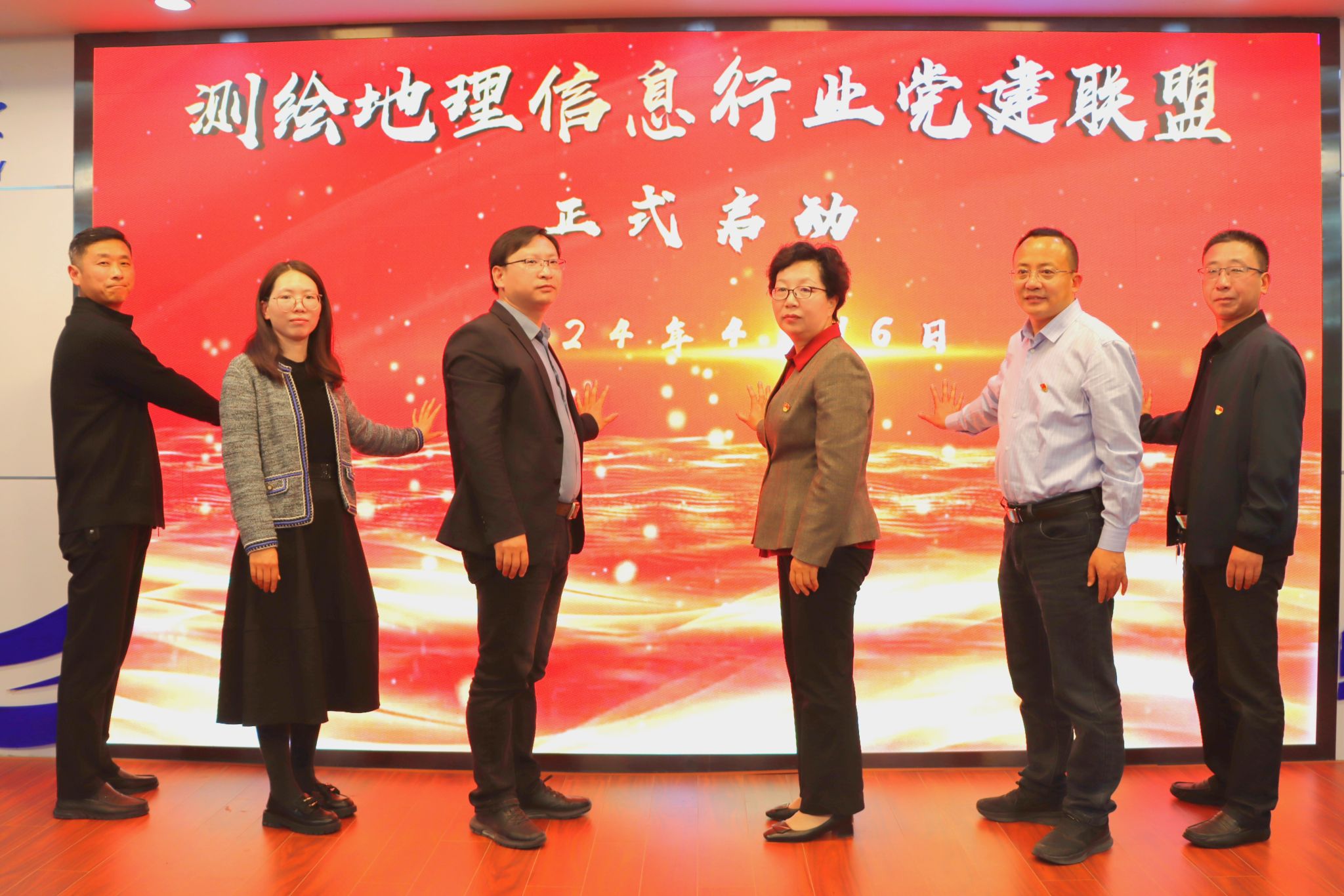 启动仪式将大会推向高潮,在全场热烈的掌声中校党委副书记李梅英、江苏省水文水资源勘测局连云港分局局长乐峰、连云港市气象局副局长陈飞、连云港市自然资源和规划局国土测绘处(地理信息管理处)处长吴铭铭、江苏省地质矿产局第六地质大队副队长陈华南、江苏省连云港地震台台长孙雷共同按动启动屏幕,标志着测绘地理信息行业党建联盟扬帆起航!