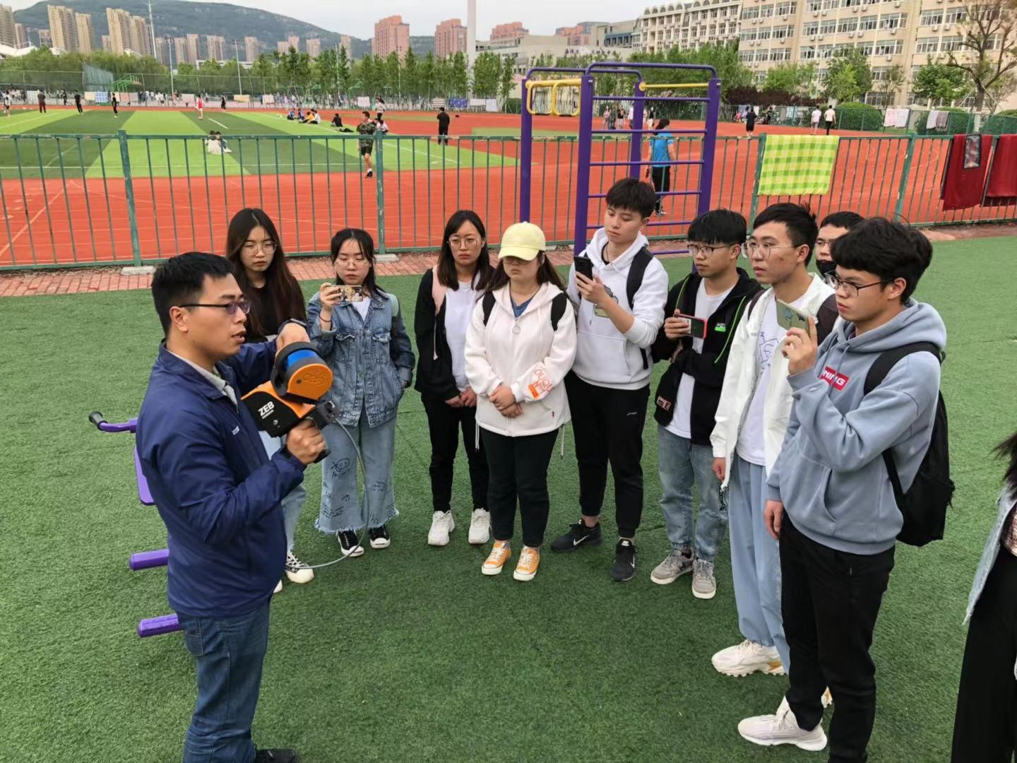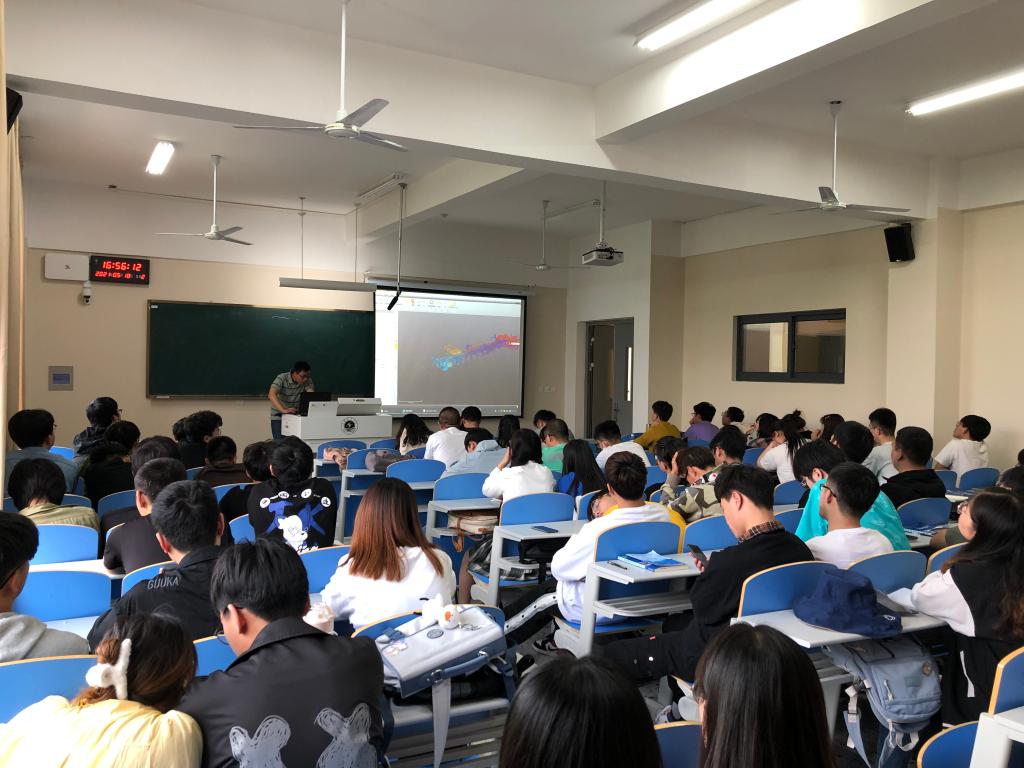 18日,卢军在测绘楼前广场为选修《移动测量技术与应用》课程的19名学生授课,开展仪器扫描演练,指导学生做了数据预处理,并走进文思楼311课堂做技术报告,讲解了GeoSLAM系列技术指标、典型应用方向、数据预处理过程软件演示和后数据处理成果等。