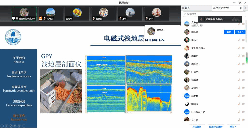 5月25日下午,中国科学院声学研究所东海研究站海底声学研究室陈晶晶副研究员在腾讯会议平台为我院师生做了题为“非线性声学与海底探测”的学术报告。报告会由院长孙佳龙主持,100多名师生在线聆听了报告。