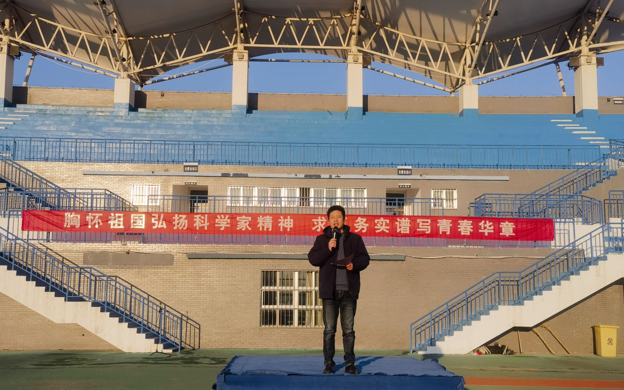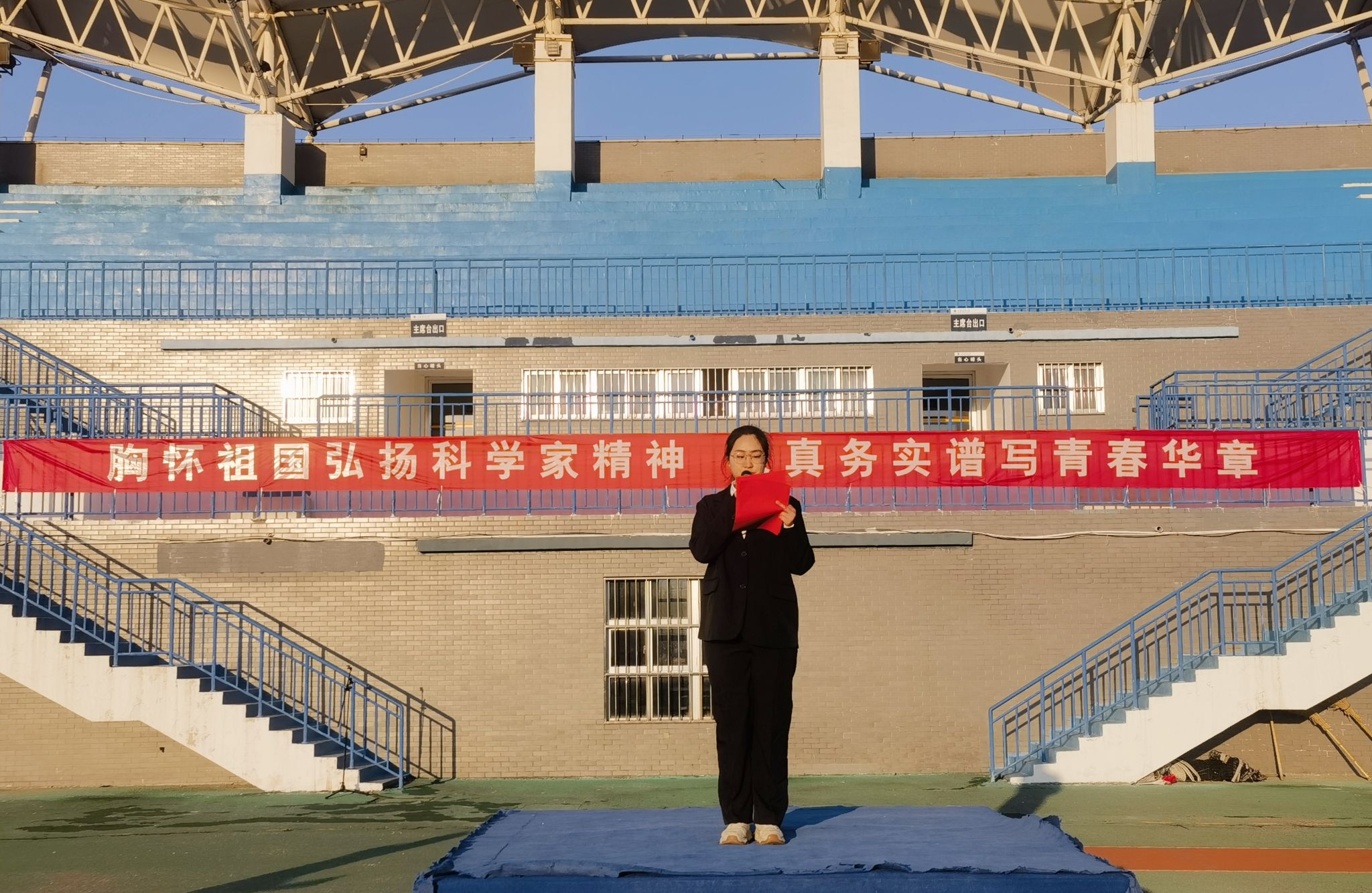 国旗仪仗队迈着整齐而坚定的步伐走向升旗台,在庄严的国歌声中,五星红旗冉冉升起。全体师生肃立,齐唱国歌,目光坚定地注视着国旗,表达着对祖国的热爱与崇敬之情。升旗仪式后,国家奖学金获得者、校学风建设先进个人、地信1221班郭珍娣同学代表全体学生发言,号召全体同学以科学家精神为指引,脚踏实地,刻苦钻研,绽放青春之光。