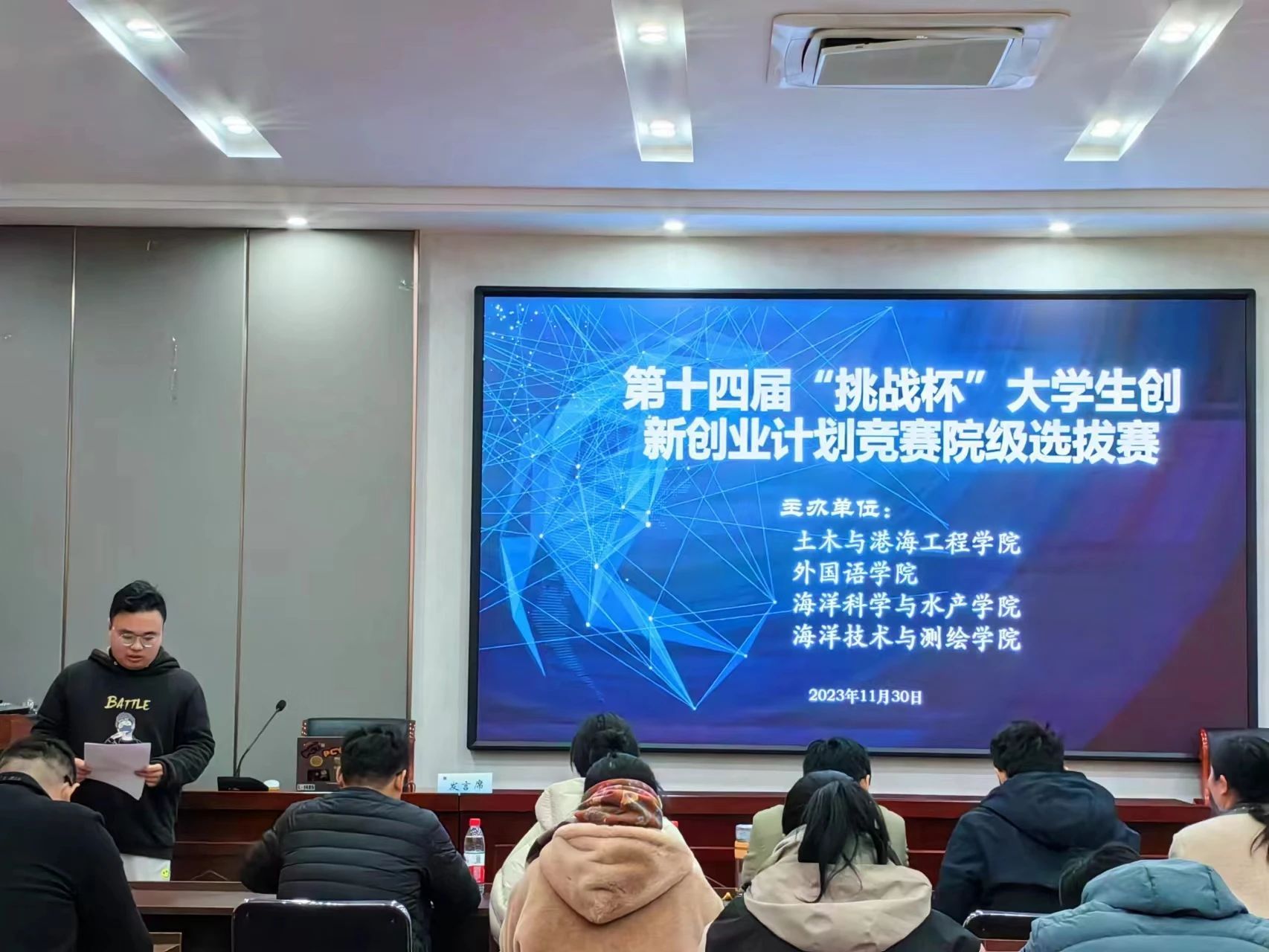 为进一步推动大学生创新创业教育工作的深入开展,培养大学生创新精神、提高大学生科研能力。2023年11月30日,由海洋技术与测绘学院、土木与港海工程学院、外国语学院和海洋科学与水产学院共同举办的第十四届“挑战杯”大学生创新创业计划竞赛院级选拔赛于江苏海洋大学苍梧校区土木楼南楼207顺利开展。海洋科学与水产学院团委书记唐振新、外国语学院团委书记王熙、土木与港海工程学院团委书记卞辉、土木与港海工程学院青年博士骆辉和海洋技术与测绘学院团委负责人纪成担任比赛评委。