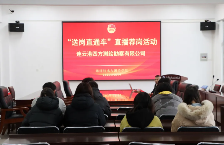 为贯彻落实党中央“六稳”“六保”决策部署,根据共青团“百校千企万岗”大学生就业帮扶工作要求,切实做好2025届毕业生就业工作,12月19日下午,学院团委在测绘楼508室举行“百校千企万岗”就业帮扶“送岗直通车”直播荐岗活动,邀请了连云港四方测绘勘察有限公司来院开展招聘会,通过线上线下相结合的方式,将招聘会搬上云端,打破了地域限制,让更多毕业生能够参与其中。