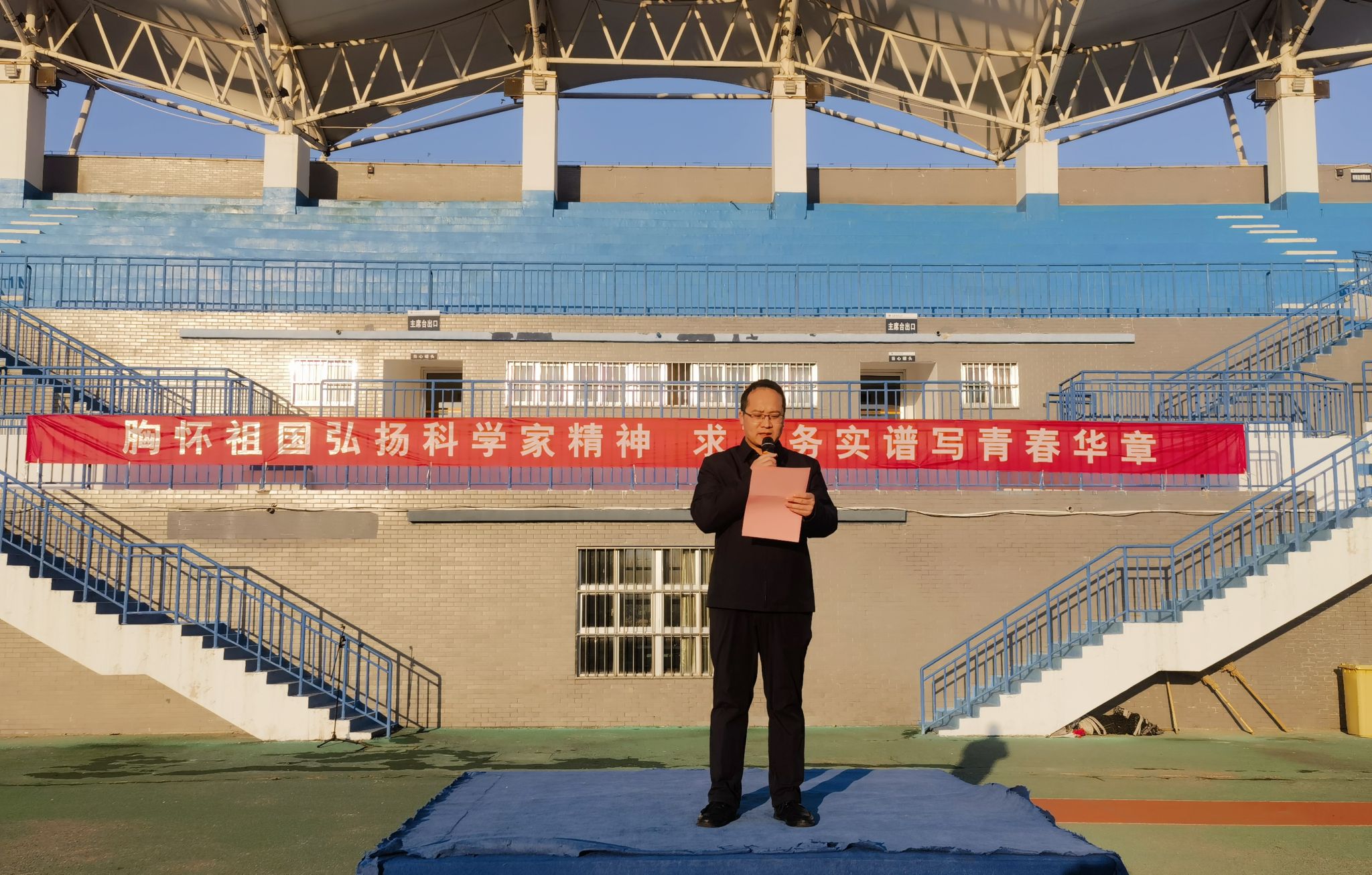国旗仪仗队迈着整齐而坚定的步伐走向升旗台,在庄严的国歌声中,五星红旗冉冉升起。全体师生肃立,齐唱国歌,目光坚定地注视着国旗,表达着对祖国的热爱与崇敬之情。升旗仪式后,国家奖学金获得者、校学风建设先进个人、地信1221班郭珍娣同学代表全体学生发言,号召全体同学以科学家精神为指引,脚踏实地,刻苦钻研,绽放青春之光。