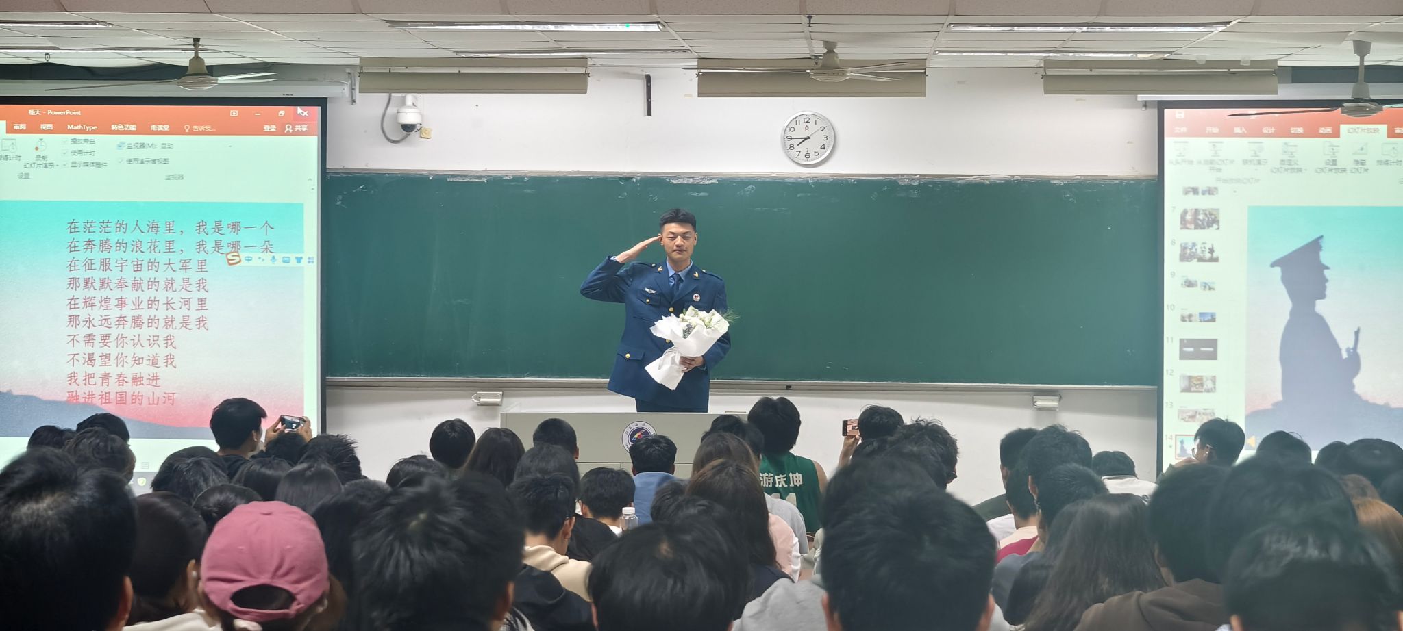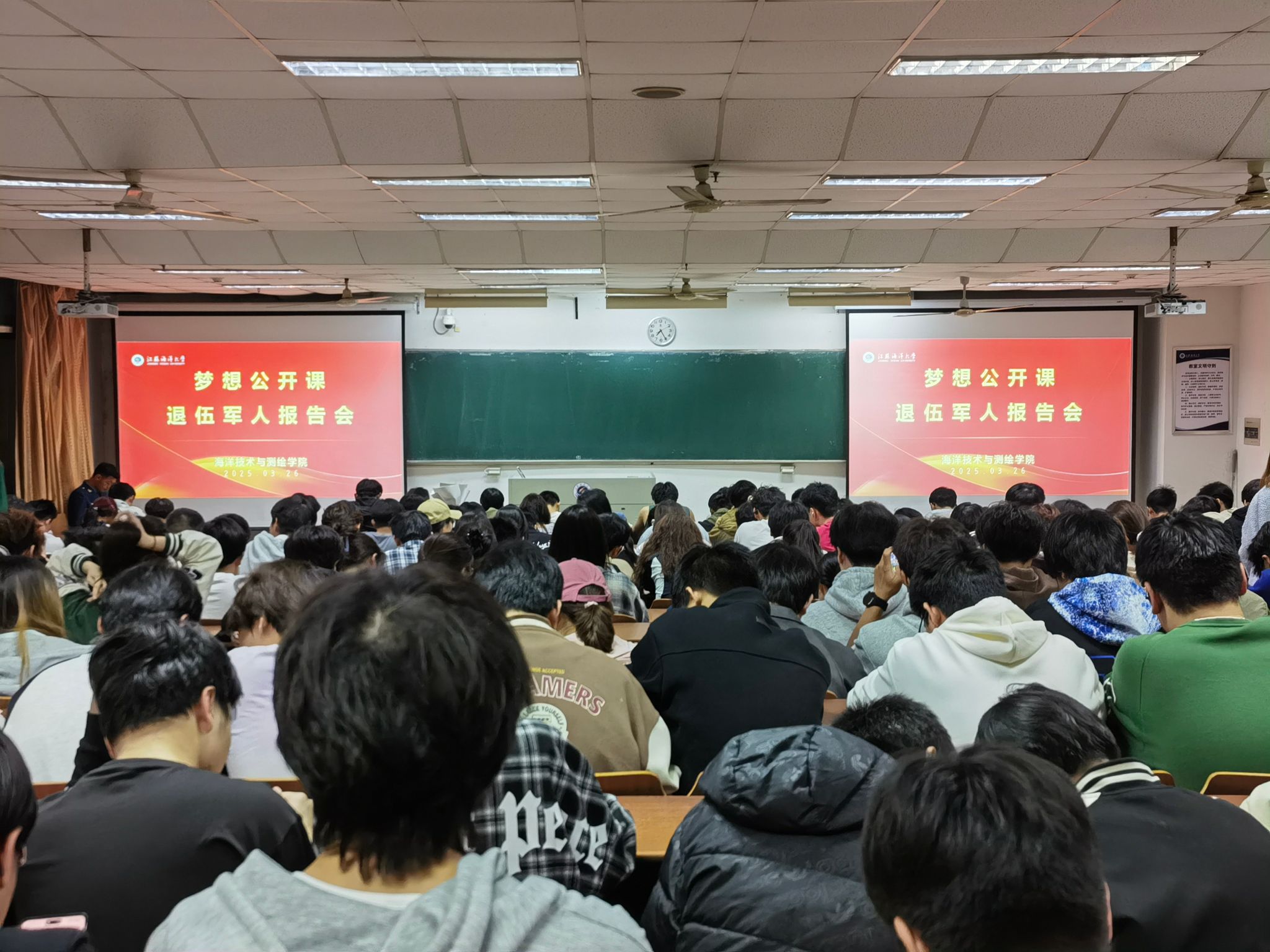 3月26日,海洋技术与测绘学院在江苏海洋大学通灌校区至善楼202教室成功举办了梦想公开课之大学生退伍军人报告会,院团委负责人纪成、学院2025年退伍大学生杨天和2024级全体大一学生参加了本次活动。