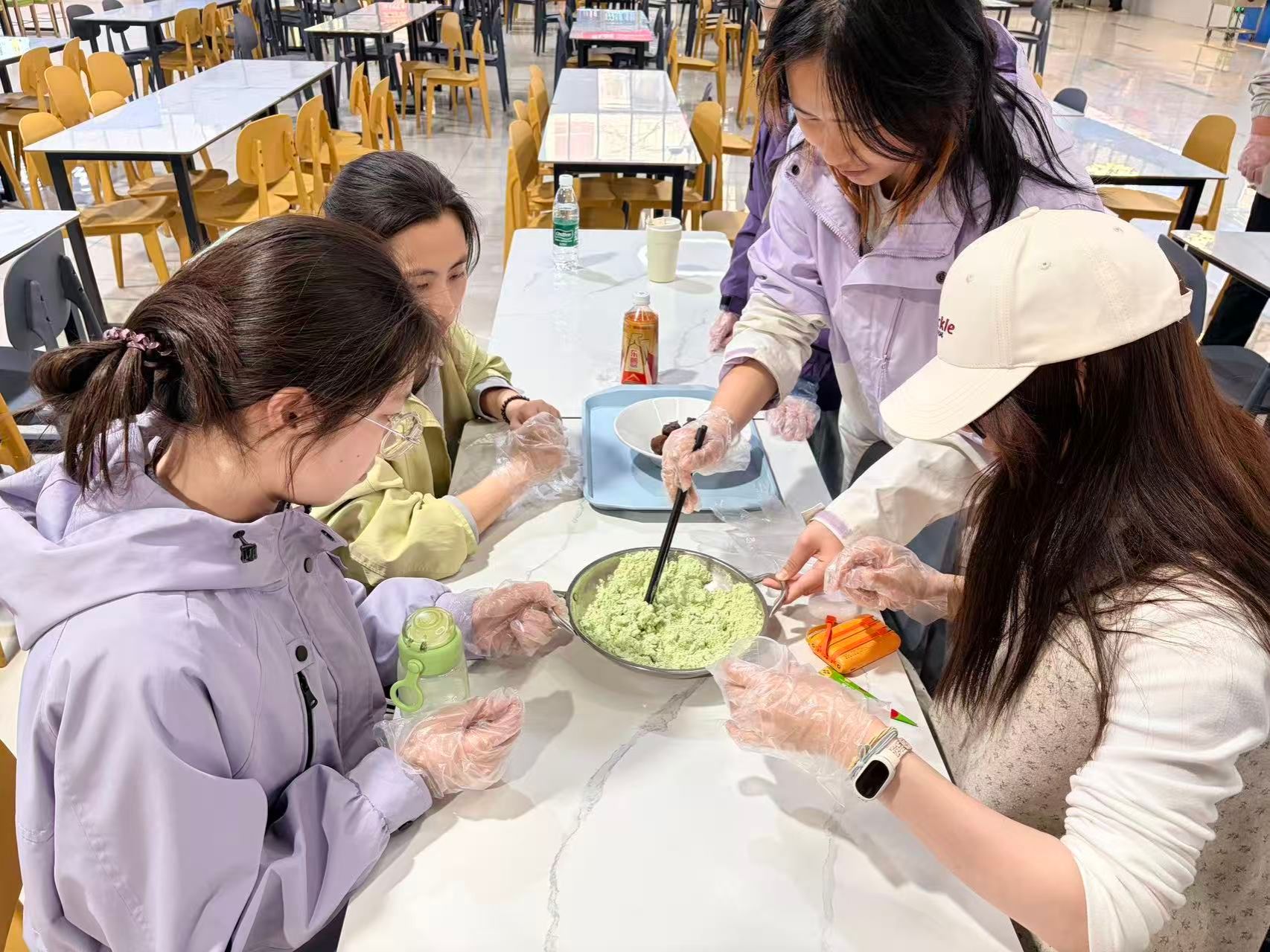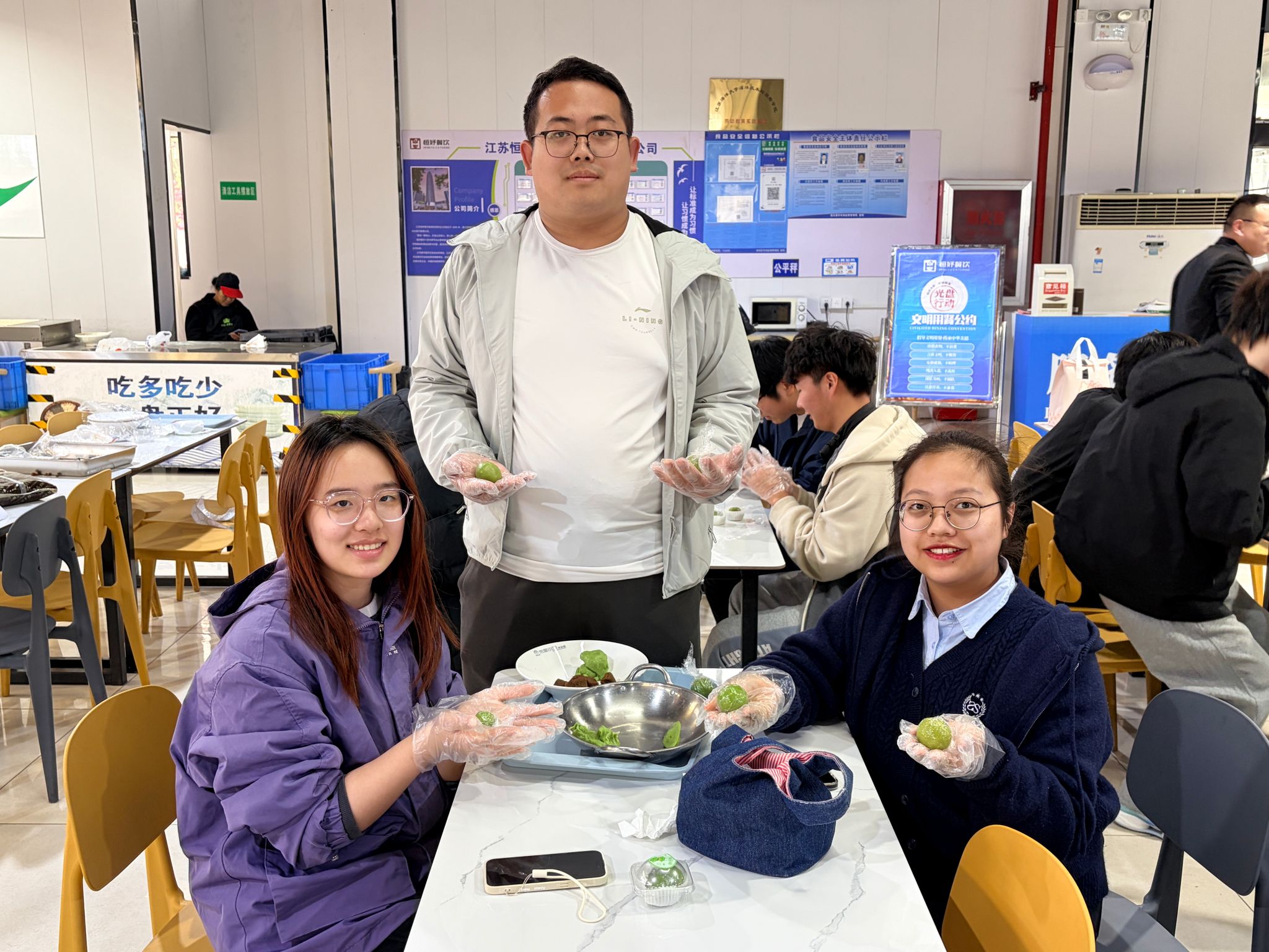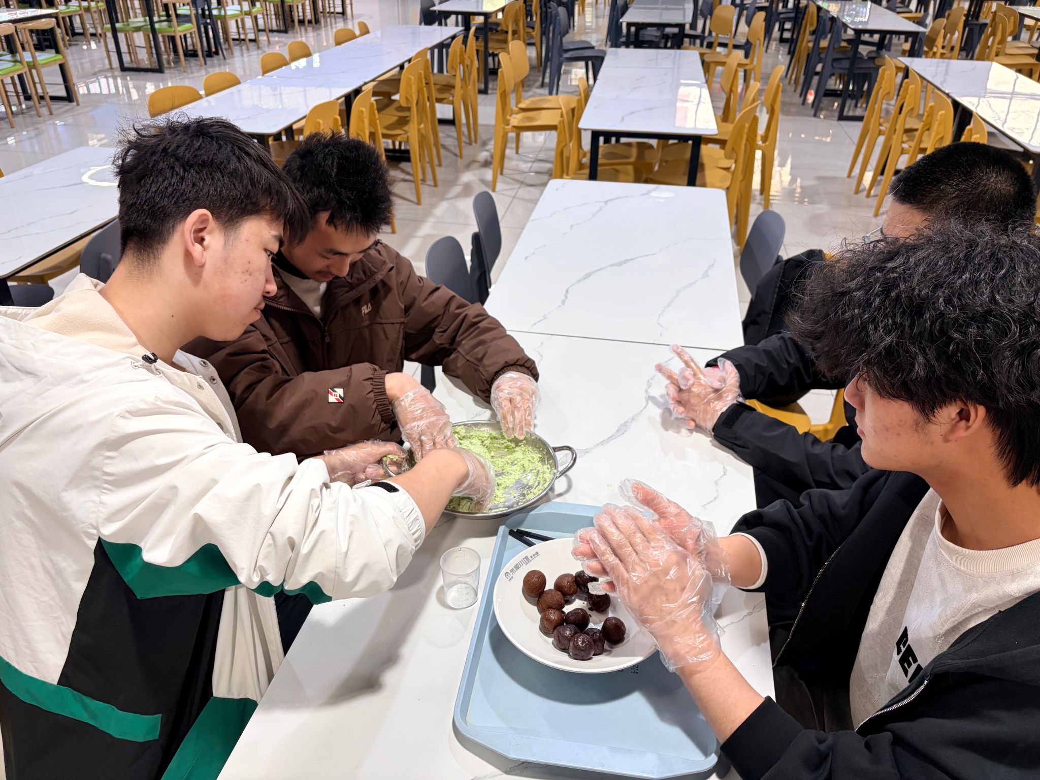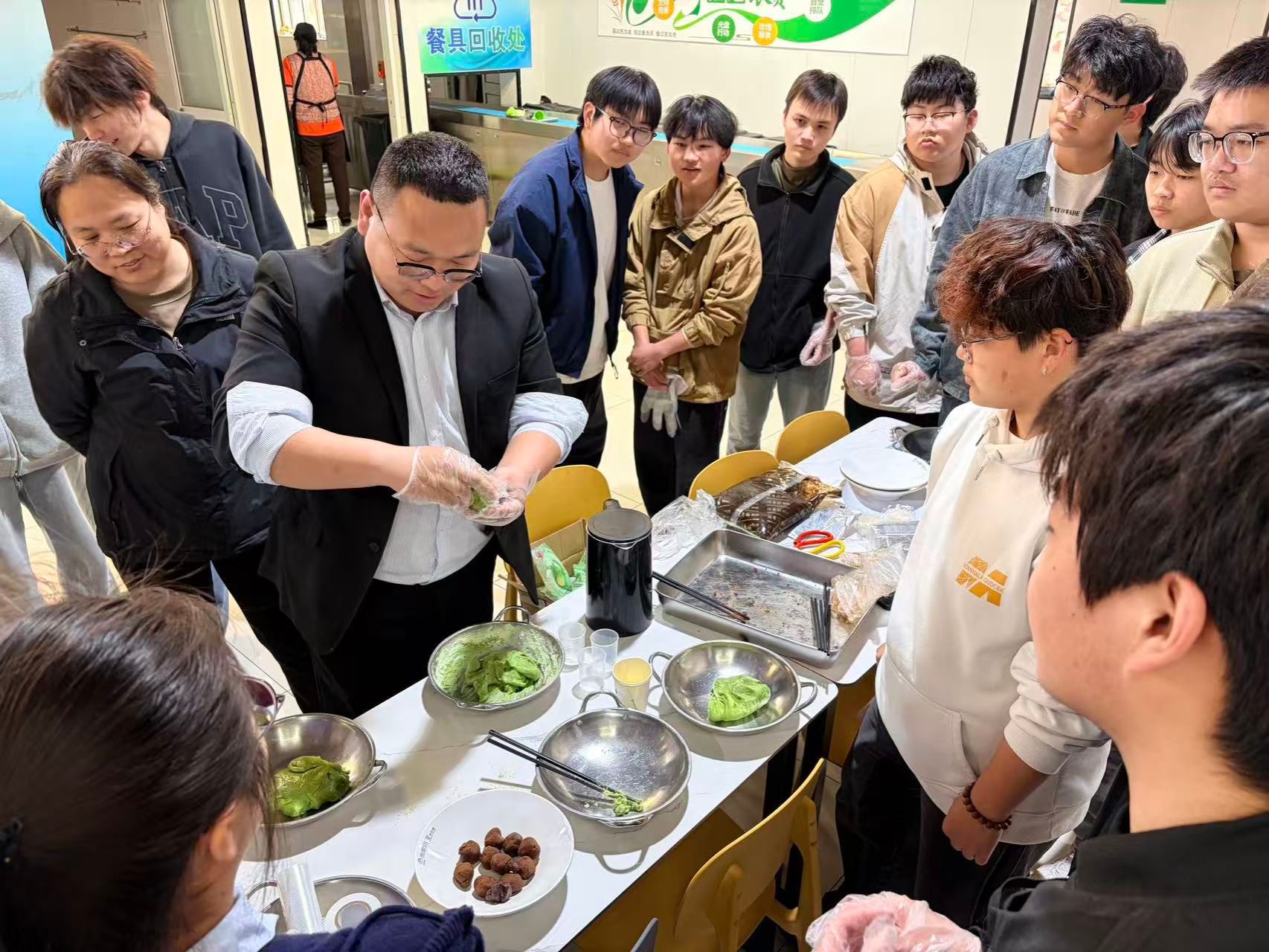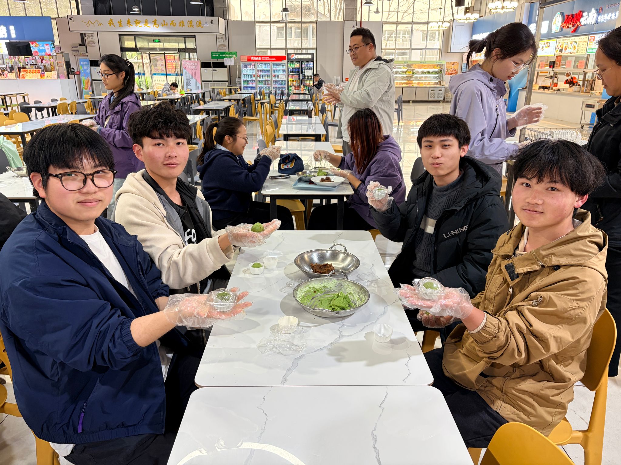 活动开始后,同学们纷纷洗净双手,围站在桌旁,投入到包青团的奇妙之旅中。食堂专业师傅为同学们耐心讲解青团的制作要领与关键细节——从青团粉与热水的调配比例,到揉面、包馅、塑形、装盒的完整流程,每一步都进行了手把手示范。同学们也纷纷动手尝试,现场氛围热闹又温馨,揉面的声音与欢笑声交织成一片。大家一边做着青团,一边聊着春日里的趣事。同学们在活动中相互交流学习,不仅学会了一项实用的生活技能,更感受到了劳动带来的成就感与喜悦。